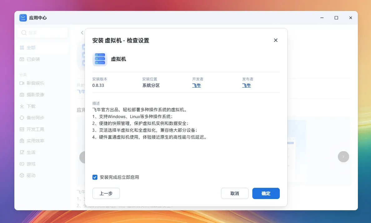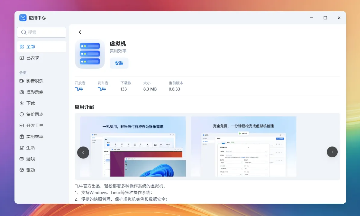 你可以从 应用中心 搜索并安装 虚拟机 应用,轻松部署多种操作系统的虚拟机。