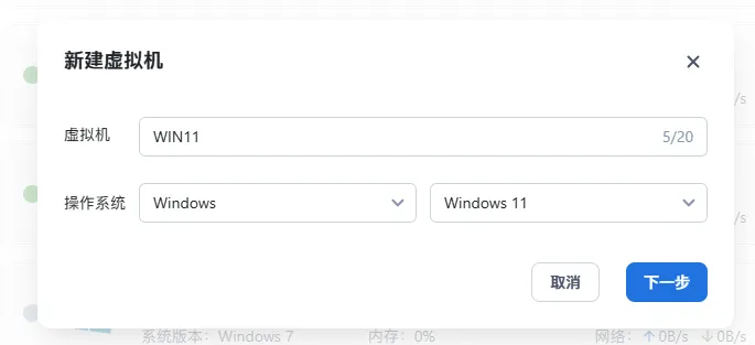 输入虚拟机名称,以在后续使用时方便辨认。选择对应的操作系统类型和操作系统版本,以在后续步骤中自动填充默认配置,点击下一步。
