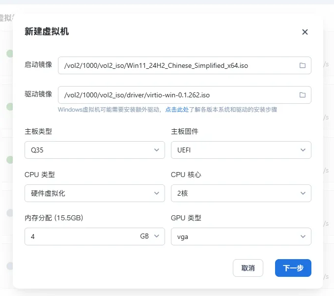 - 从 NAS 上选择 Windows 对应版本的驱动 ISO 文件,可在上方的”驱动程序下载“按版本下载。如果你不需要使用 VirtIO 类型的虚拟磁盘和虚拟网络, 可以忽略该项。