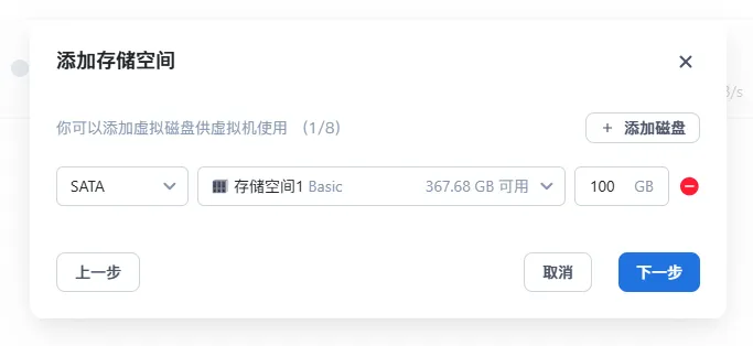 点击添加虚拟磁盘,分别选择对应的磁盘总线类型,选择要使用的存储空间,输入分配的容量。最多支持创建 8 个虚拟磁盘。确认后点击下一步。