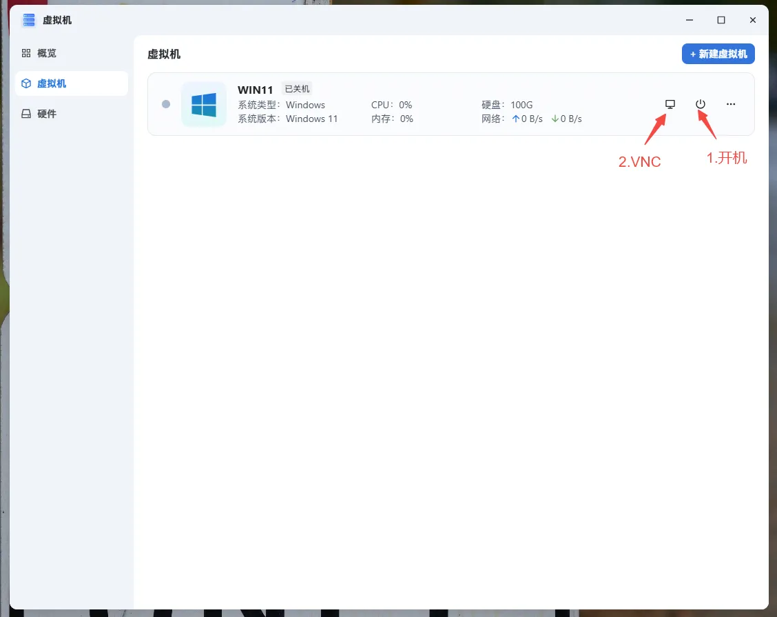 点击创建,稍等片刻即可完成虚拟机创建。然后,点击电源按钮启动运行虚拟机,并点击 VNC 连接访问。