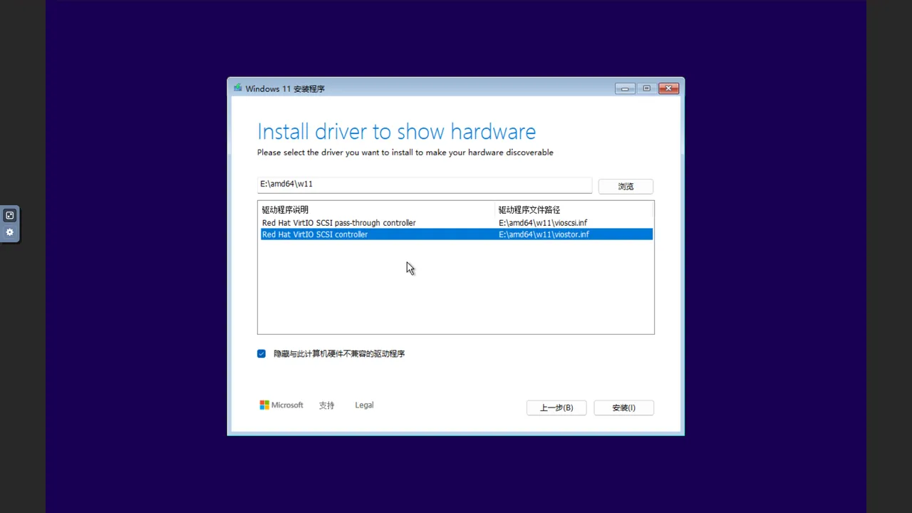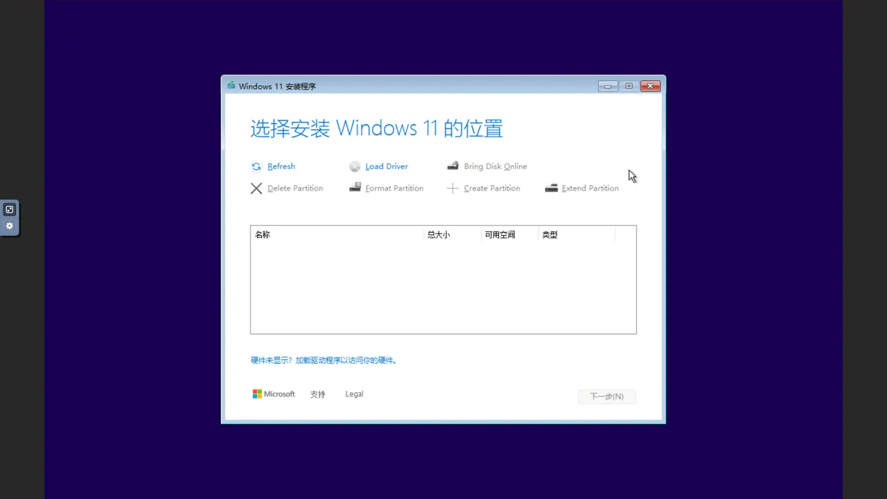 在“选择安装 Windows 11 的位置“这一步,如果选择了 VirtIO 类型的磁盘,需要安装驱动程序以识别虚拟硬盘硬件。请先确认虚拟机已挂载驱动 ISO 文件,然后点击“加载驱动”/“Load Driver”