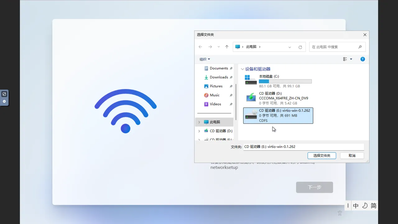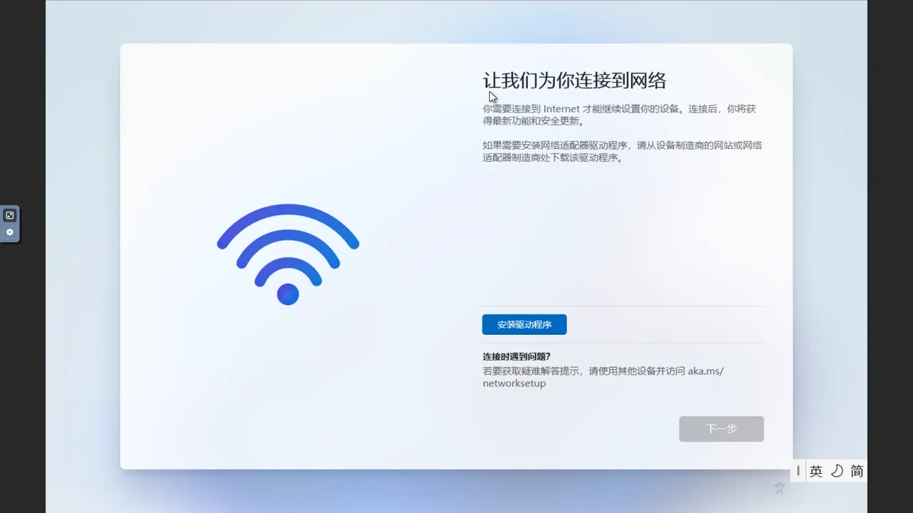 在初始化流程的“让我们为你连接到网络”这一步,如果选择了 VirtIO 的网络类型,需要安装驱动程序以识别虚拟网络硬件。请先确认虚拟机已挂载驱动 ISO 文件,然后点击安装驱动程序