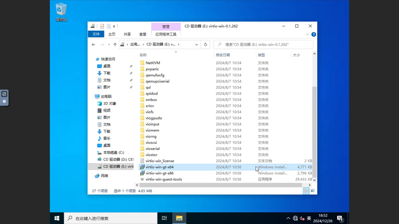 找到并打开 virtio-win-gt-x64.msi 文件(如果是 32 位的操作系统请选择 virtio-win-gt-x86.msi),按照指引完成驱动安装。